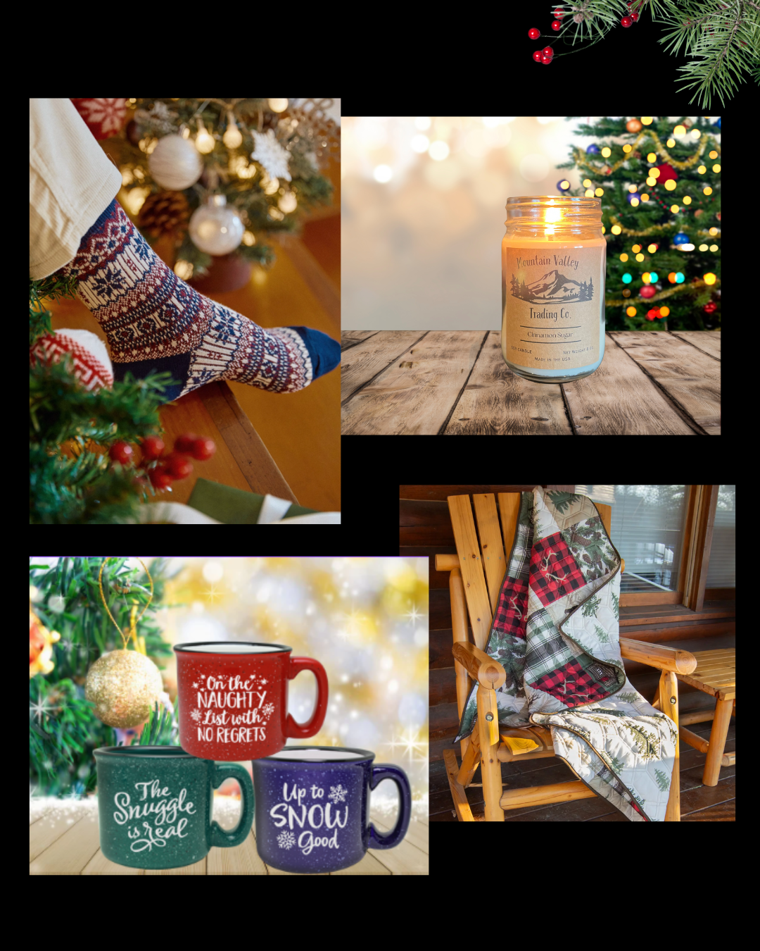 Wrap yourself in warmth and a little mountain magic this season. From soft throw blankets, comfy socks and hand-poured candles to festive mugs that make every sip feel like home — everything here is designed to bring comfort, calm, and Christmas cheer to your cabin or cozy corner