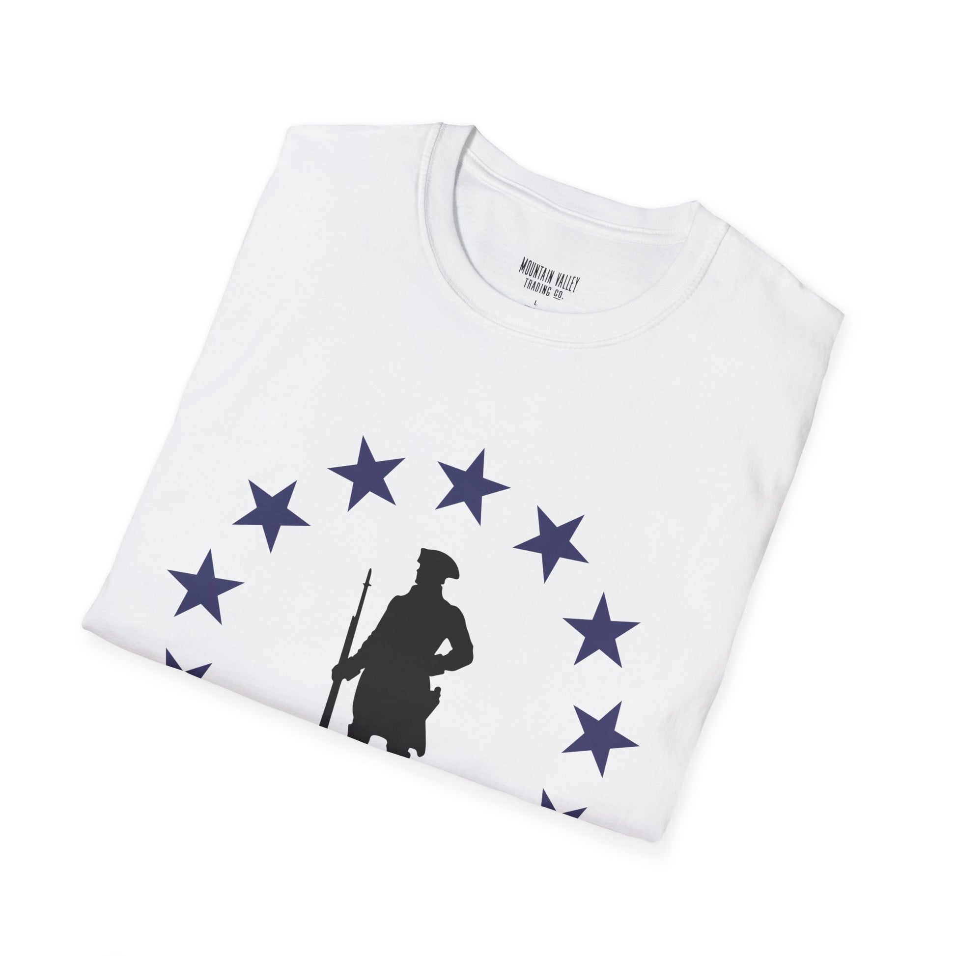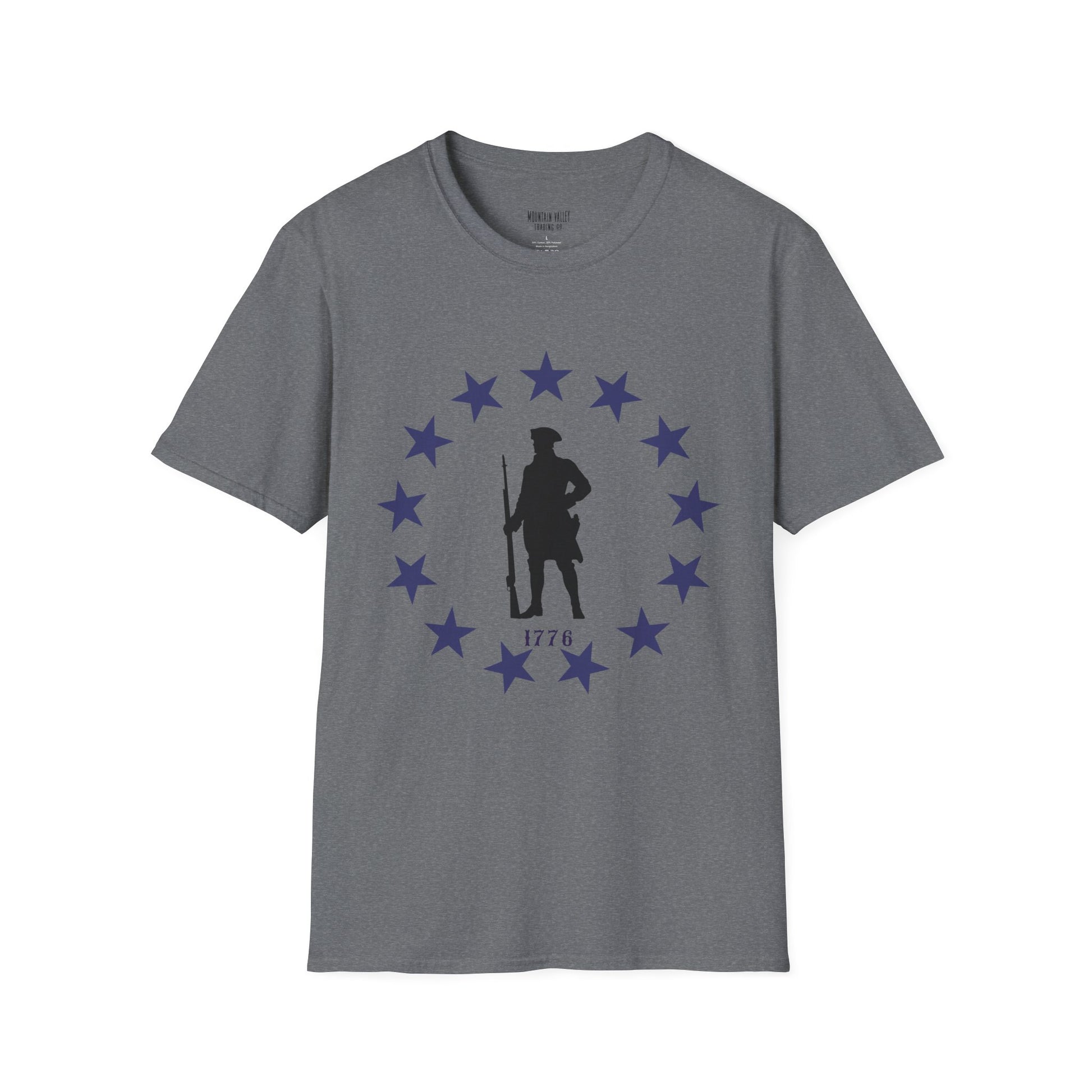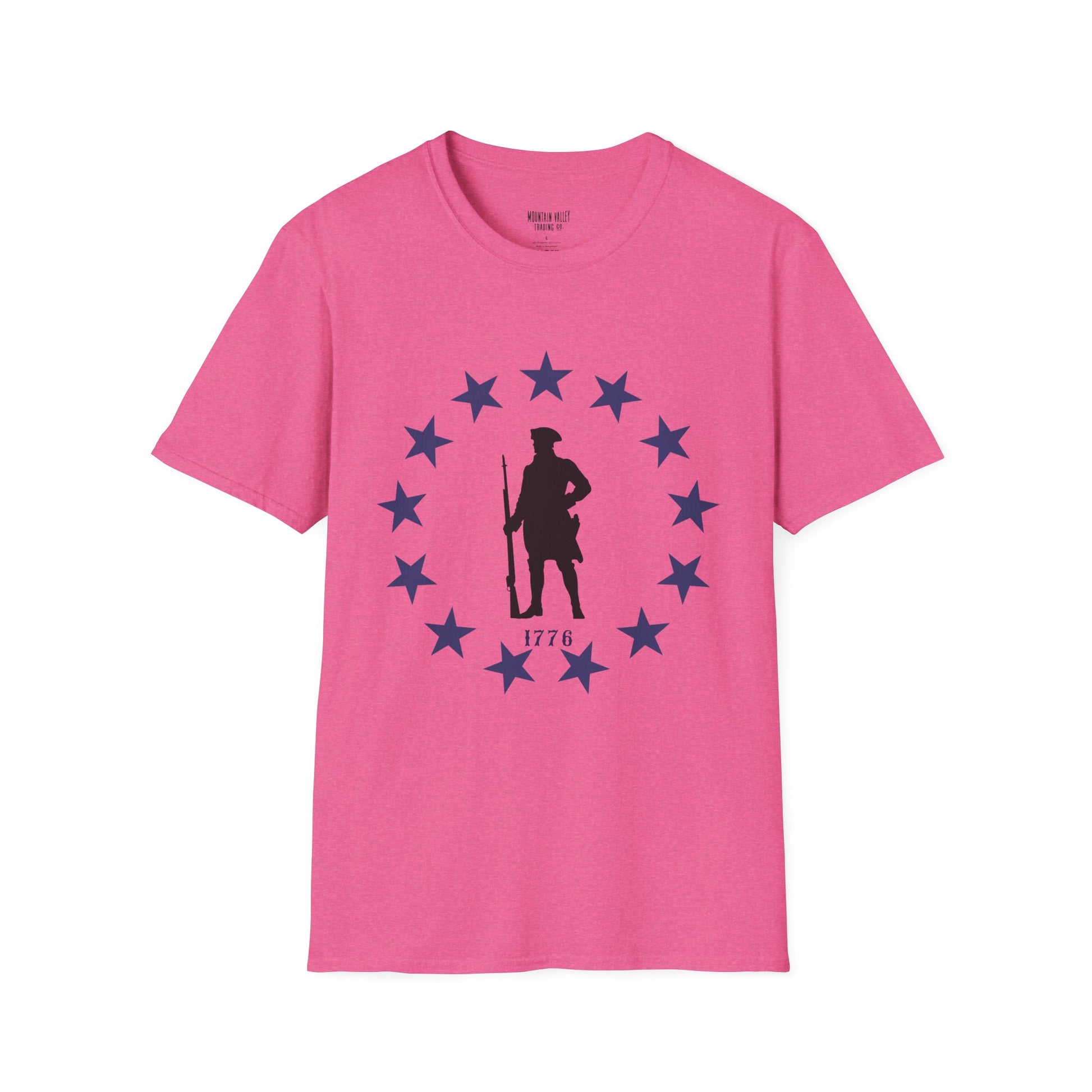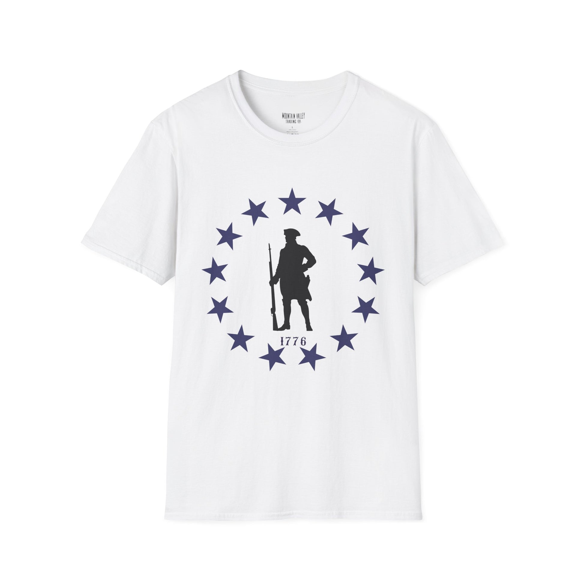 Stand tall with the spirit of the original freedom fighters. This tee features a battle-ready Revolutionary War soldier encircled by stars — a bold nod to the year America declared its independence and dared the impossible. Whether you’re rallying at the grill or marching through your local parade, this shirt says one thing loud and clear:
