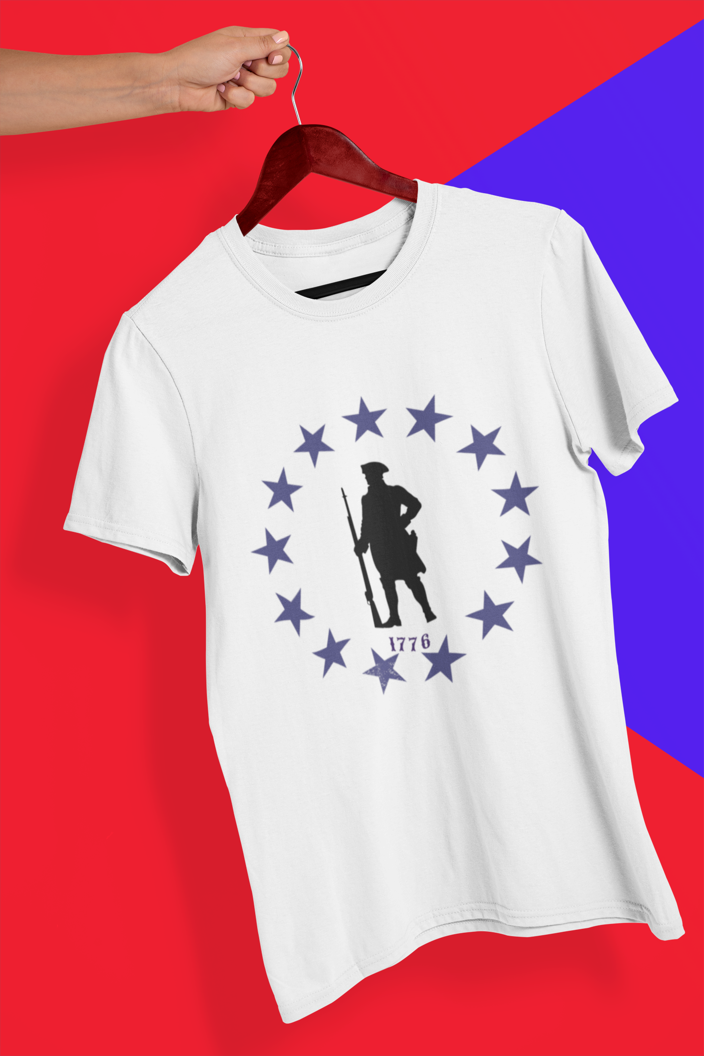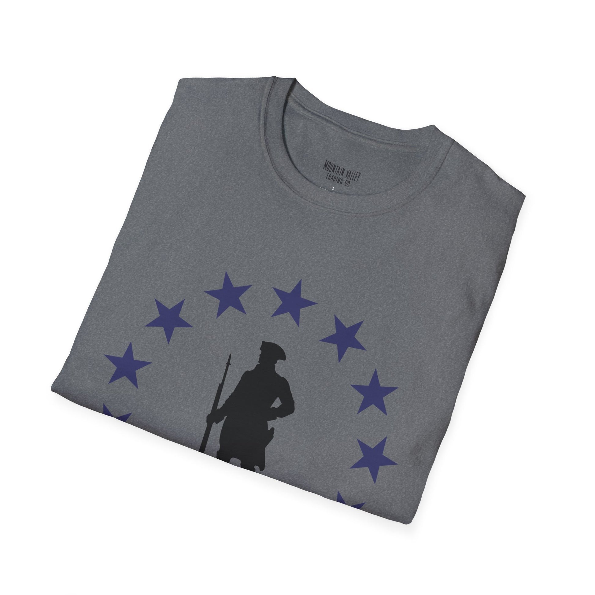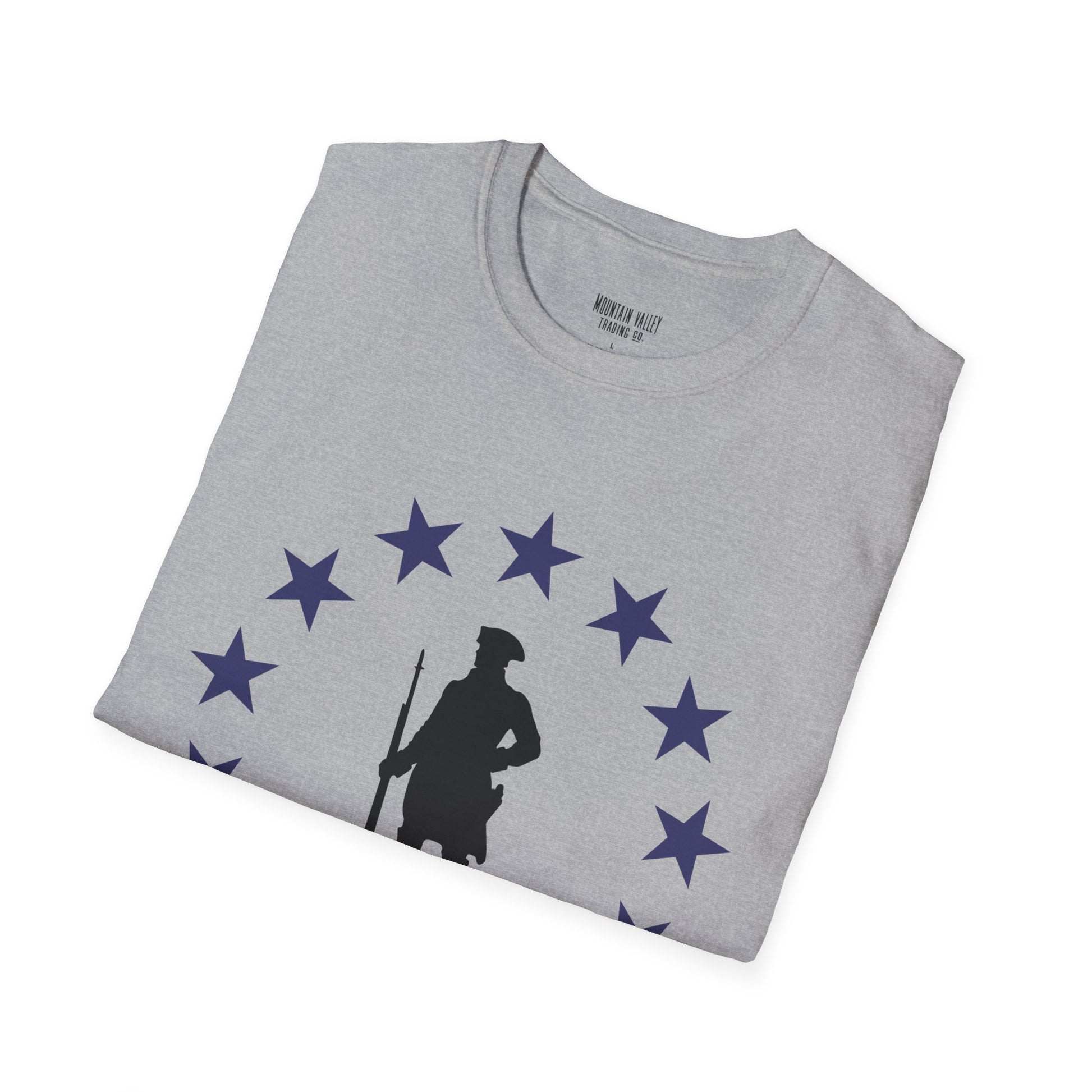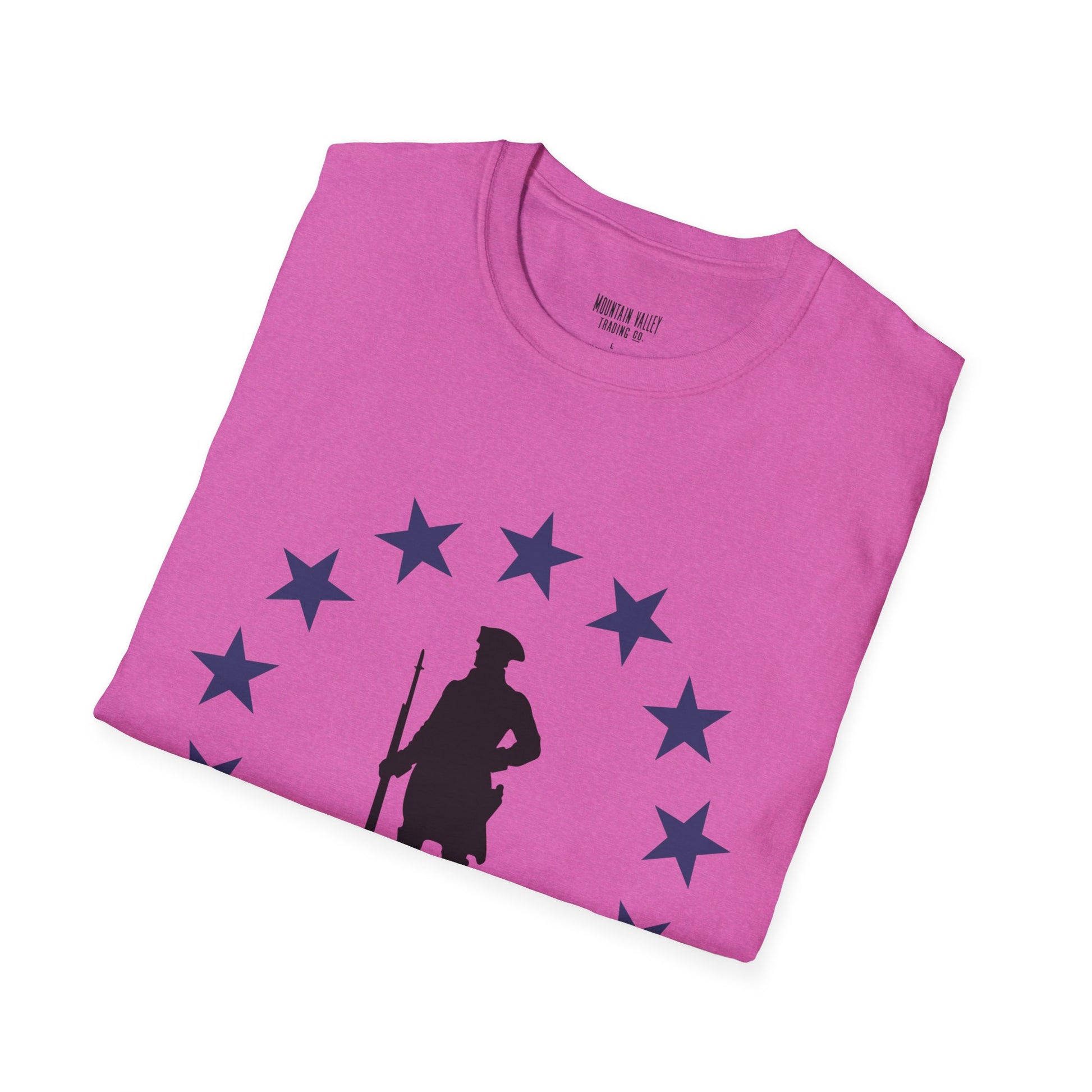 Stand tall with the spirit of the original freedom fighters. This tee features a battle-ready Revolutionary War soldier encircled by stars — a bold nod to the year America declared its independence and dared the impossible. Whether you’re rallying at the grill or marching through your local parade, this shirt says one thing loud and clear: