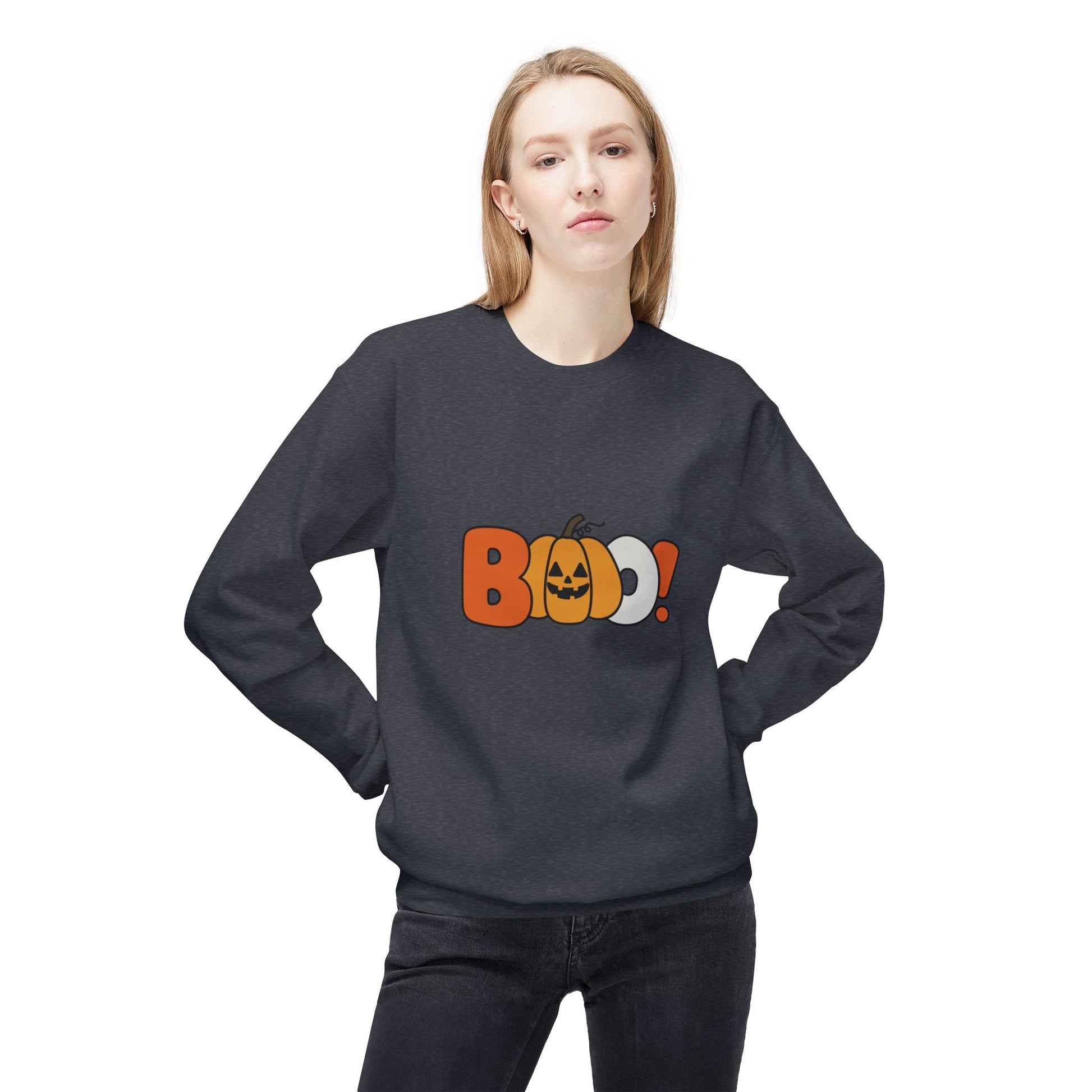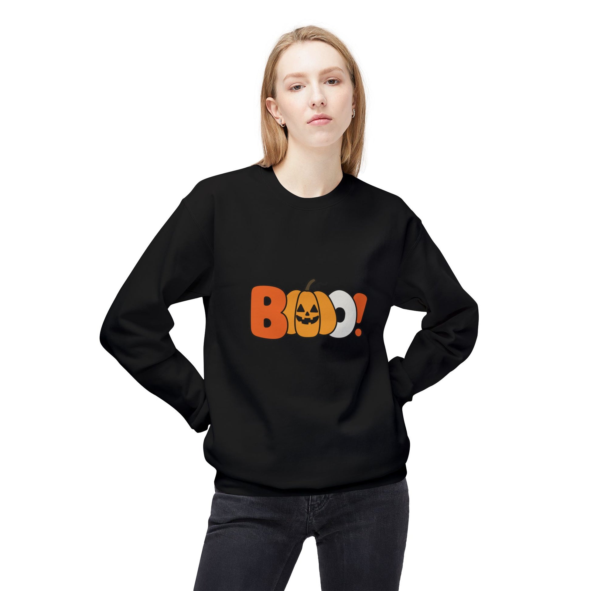 Sometimes all you need is one word: BOO! Bold, spooky, and straight to the point—this sweatshirt makes a statement whether you’re handing out candy or haunting the couch with snacks.