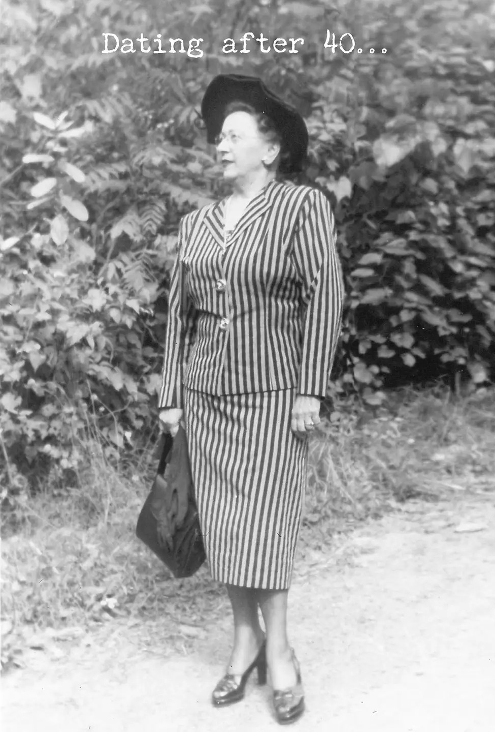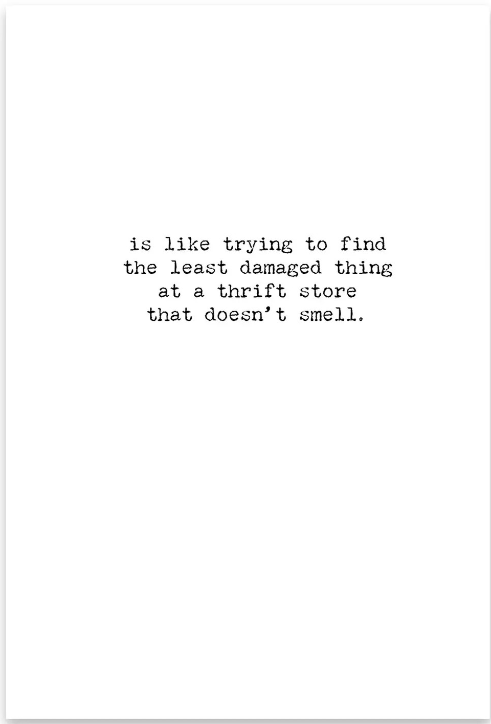 A humorous greeting card from our Trash Talk by Annie Collection features a vintage photograph with "Dating After 40…" sentiment on the outside, and "Is Like Trying To Find The Least Damaged Thing At A Thrift Store That Doesn't Smell." sentiment on the inside.