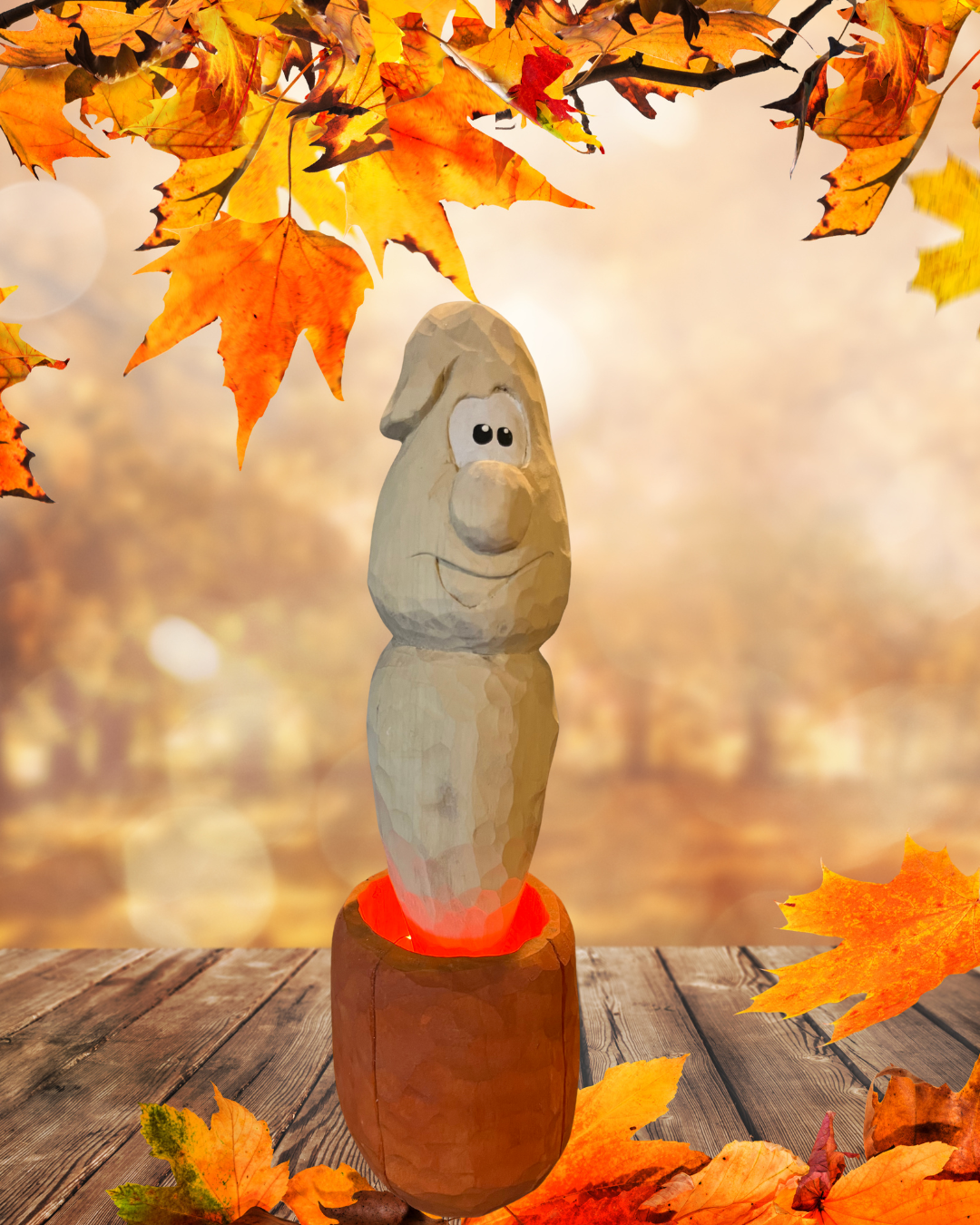 Meet the friendliest spirit of the patch! This happy little ghost is floating right out of his glowing pumpkin home, wrapped in warm orange light and full of Halloween cheer. Hand-carved and one-of-a-kind, he’s the kind of guest who won’t haunt you—he’ll just light up your shelf with spooky-sweet charm.
