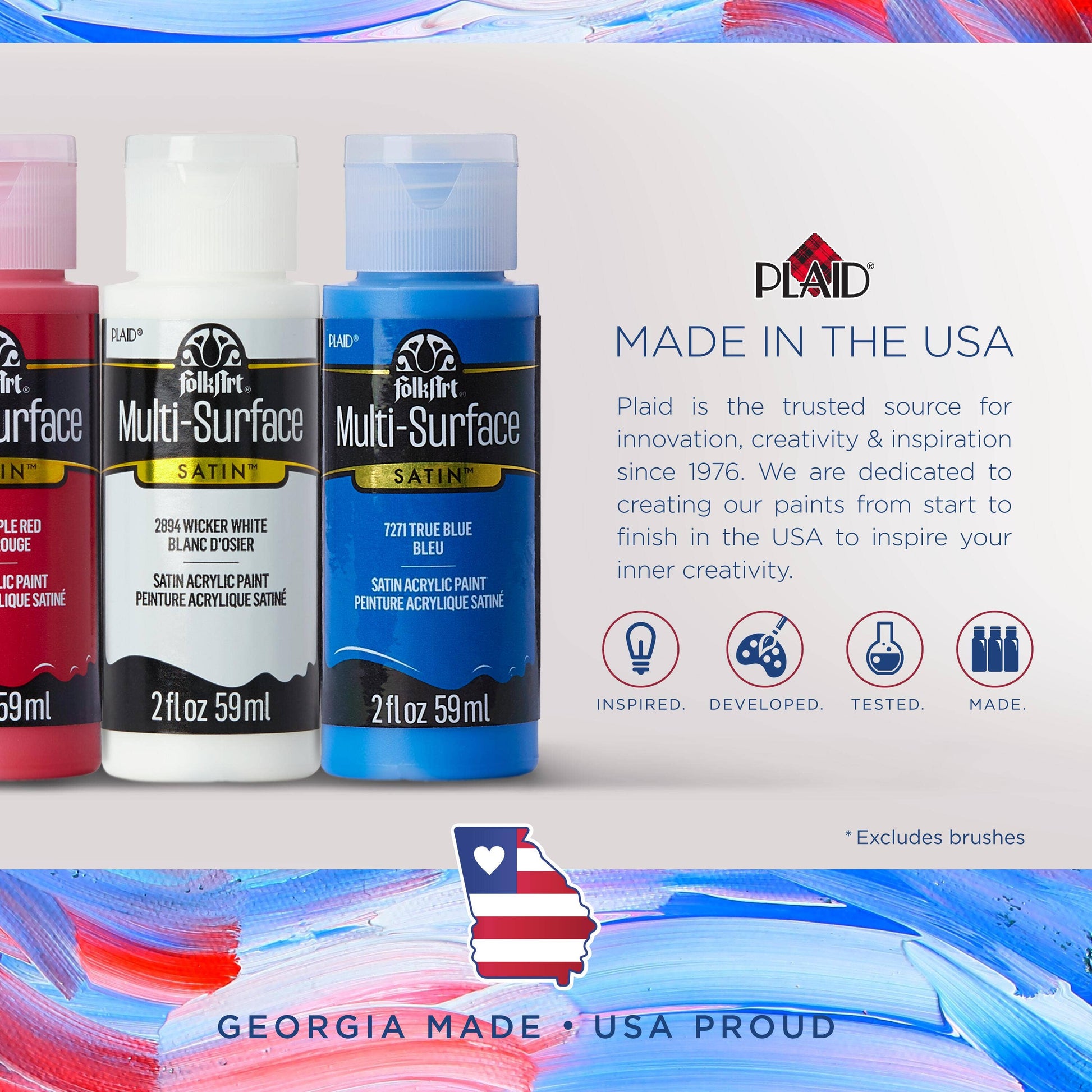 FolkArt Multi-Surface Acrylic Paint provides a wide array of beautiful colors perfect for the crafter and decorative painter. Each of the colors in this line of superior quality acrylic paints has a creamy, smooth consistency with excellent coverage. Whether you are a novice or expert crafter, you will love the versatility of this acrylic paint as part of your arts and crafts supplies. Use this multi-surface paint on a variety of surfaces such as wood, terra cotta, canvas, glass, fabric, ceramics and more. With this multi-surface acrylic paint, you can do everything from intricate detail work to stenciling for a fresh look to all your DIY projects. This formula is also great for indoor and outdoor projects as well as top-shelf dishwasher safe when cured. Make FolkArt Multi-Surface Acrylic Paint a must-have addition to your art supplies.