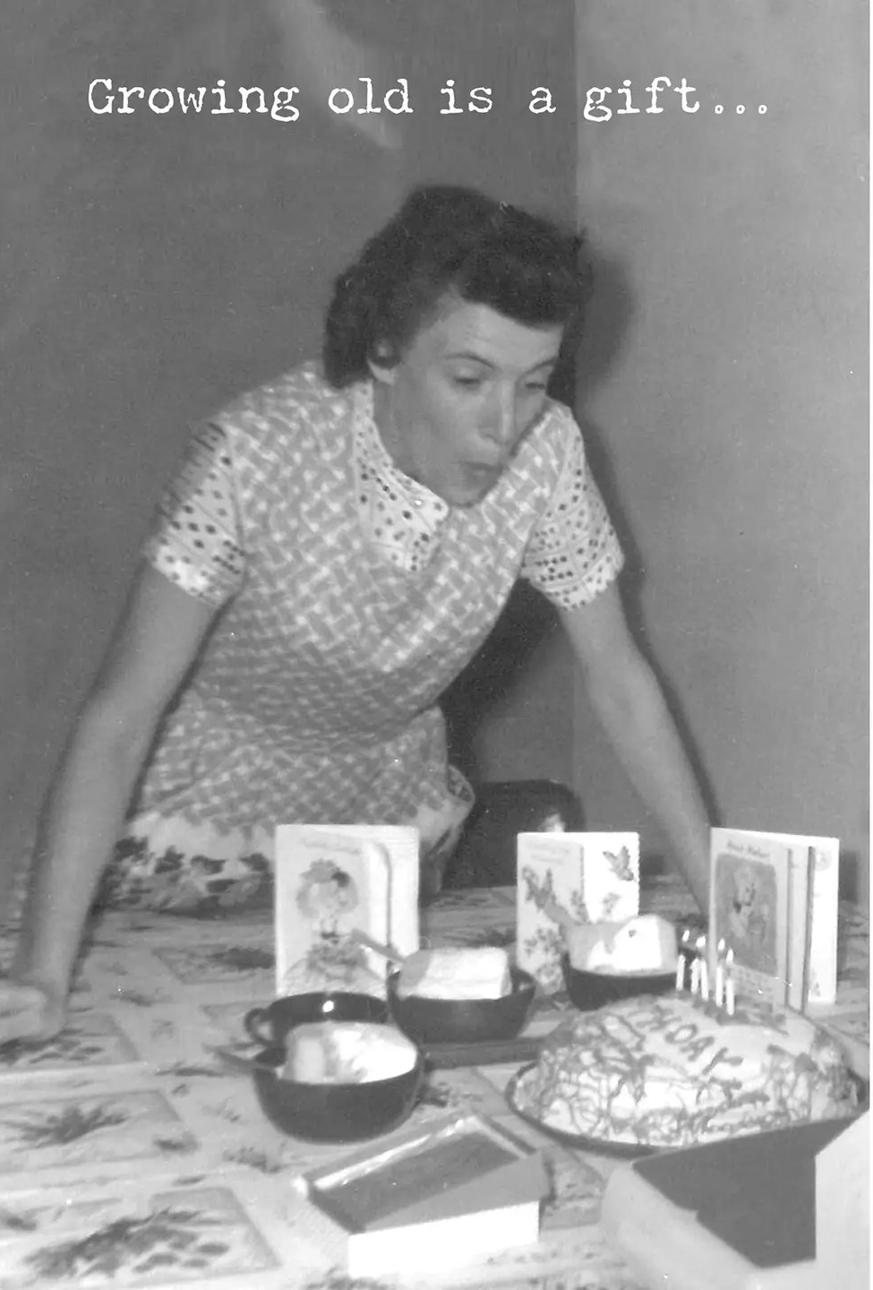A humorous greeting card from our Trash Talk by Annie Collection features a vintage photograph with "Growing Old Is A Gift…" sentiment on the outside, and "Wetting Yourself When You Blow Out The Candles, Not So Much. Happy Birthday." sentiment on the inside.
