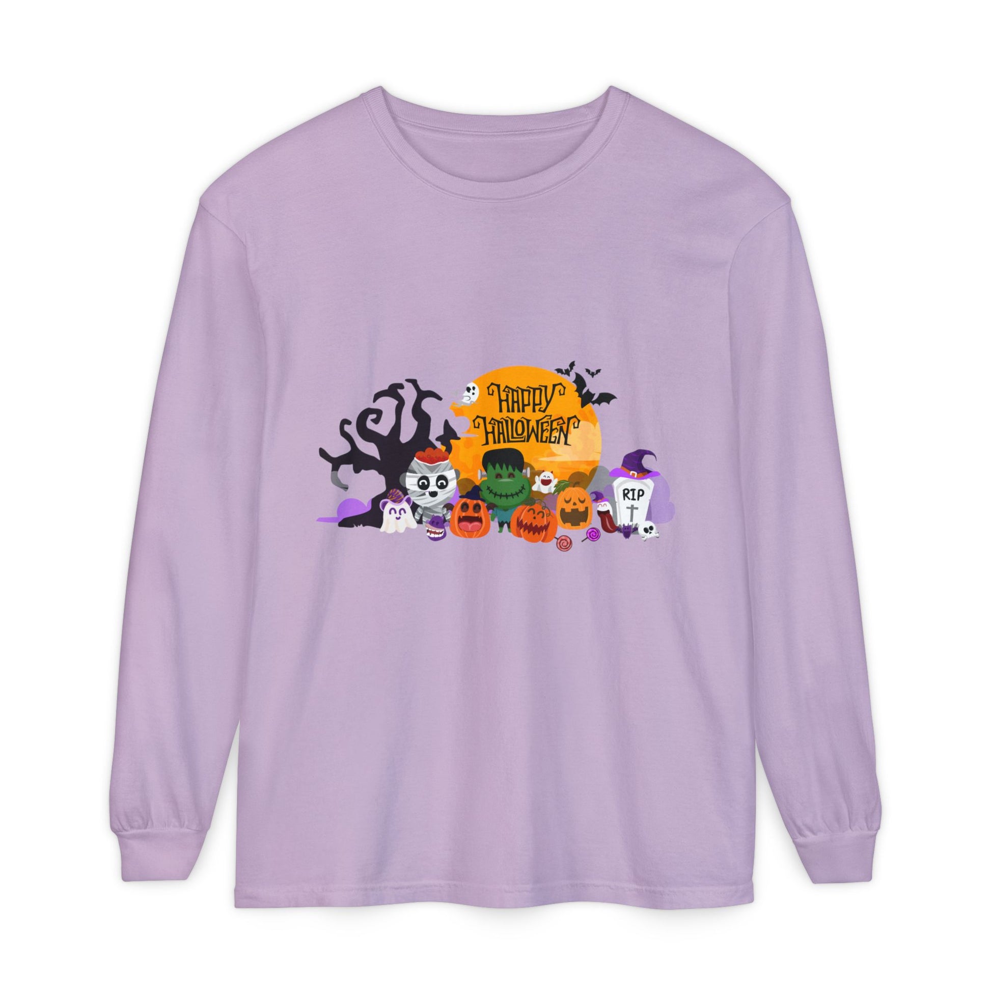 Celebrate spooky season with smiles instead of scares! This comfy long sleeve tee features a fun mix of friendly Halloween characters — pumpkins, ghosts, bats, and more — gathered around a bold “Happy Halloween” message. Perfect for teachers who love festive, classroom-approved fun!