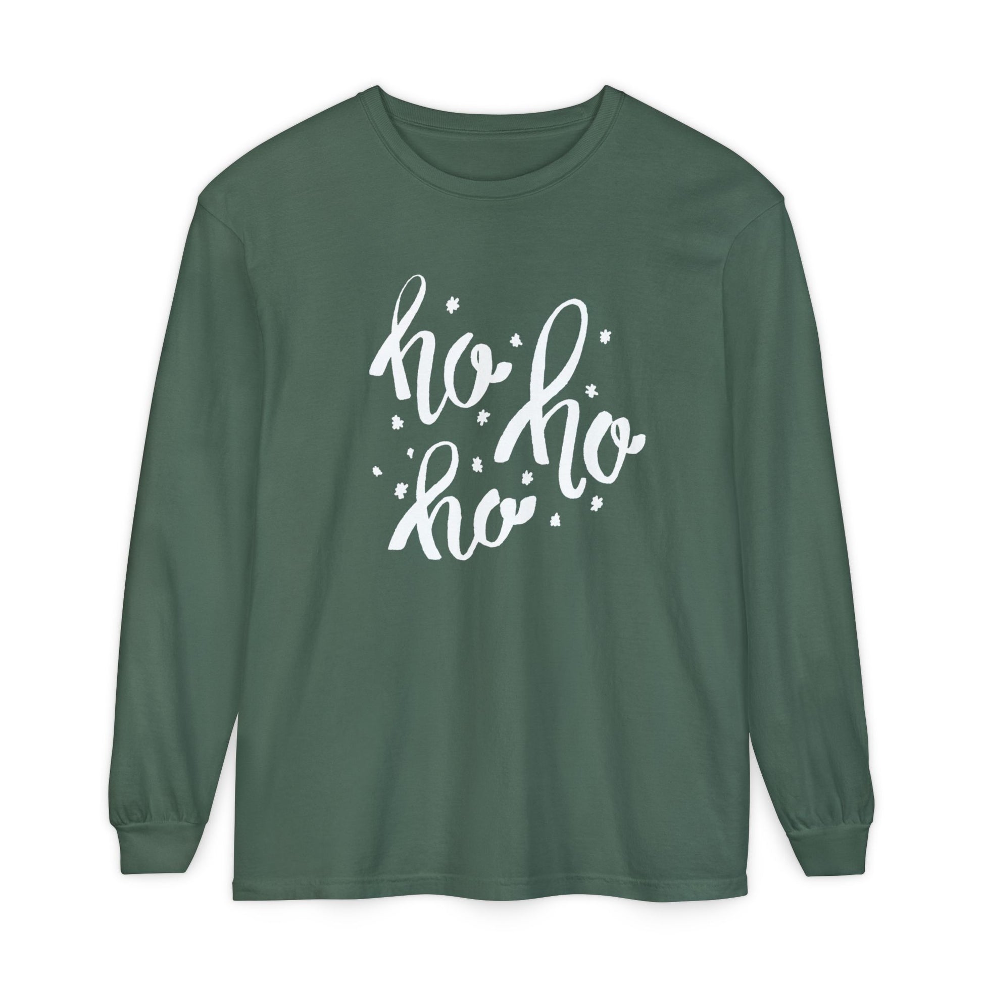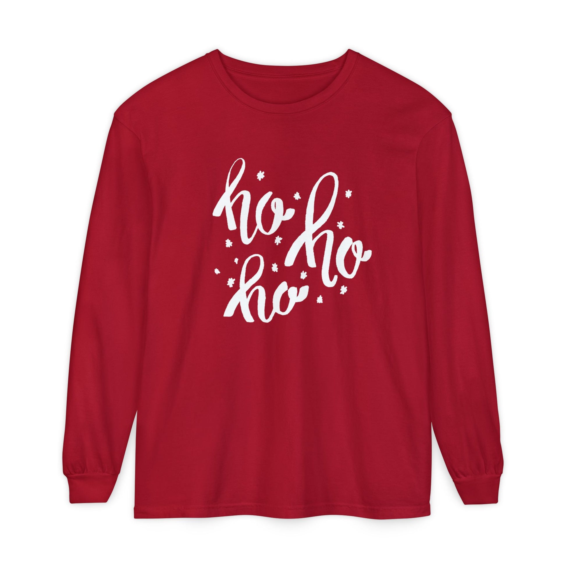 Get into the spirit of the season with our Ho Ho Ho Long Sleeve Tee. This festive red shirt features a playful handwritten script surrounded by snowy dots, giving it that perfectly cheerful Christmas look. Soft, cozy, and easy to wear, it’s the ideal long sleeve for holiday parties, Christmas morning photos, or sipping cocoa by the fireplace.