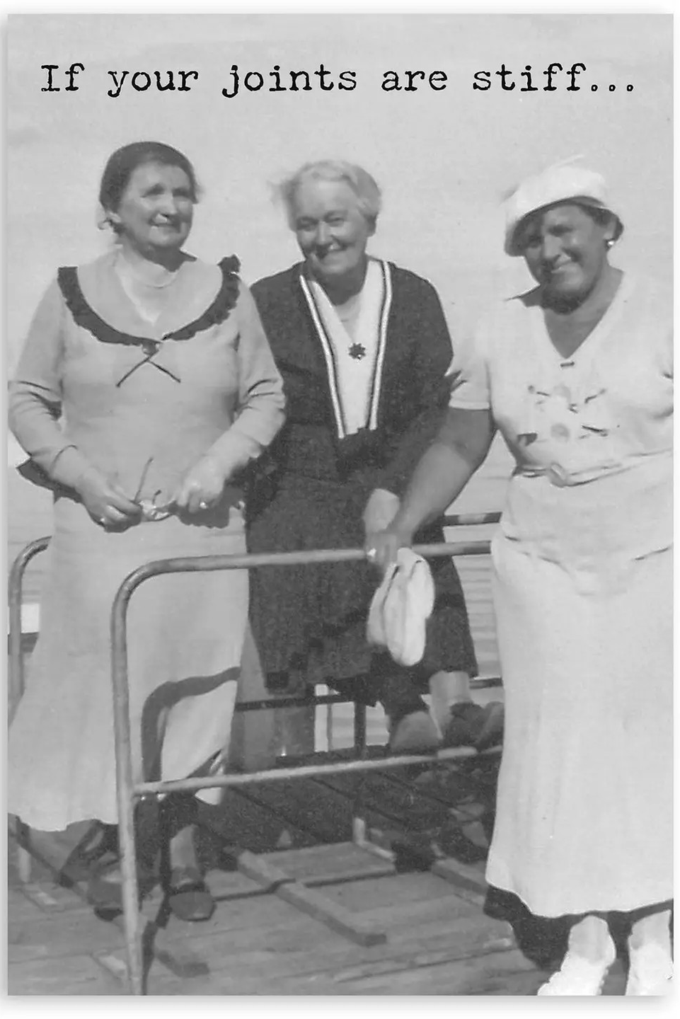 A humorous greeting card featuring vintage photography with outside "If Your Joints Are Stiff..." and inside "You're Probably Just Rolling Them Too Tight."
