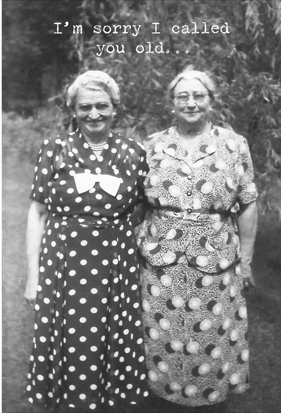 A humorous greeting card from our Trash Talk By Annie Collection displaying a vintage photograph with complementing sentiments. Card features "Sorry I Called You Old..." sentiment on the outside and "I Thought You Knew." sentiment on the inside with space to add a personalized message. Our Sorry I Called You Old greeting card is a hilarious gifting option for everyday moments.
