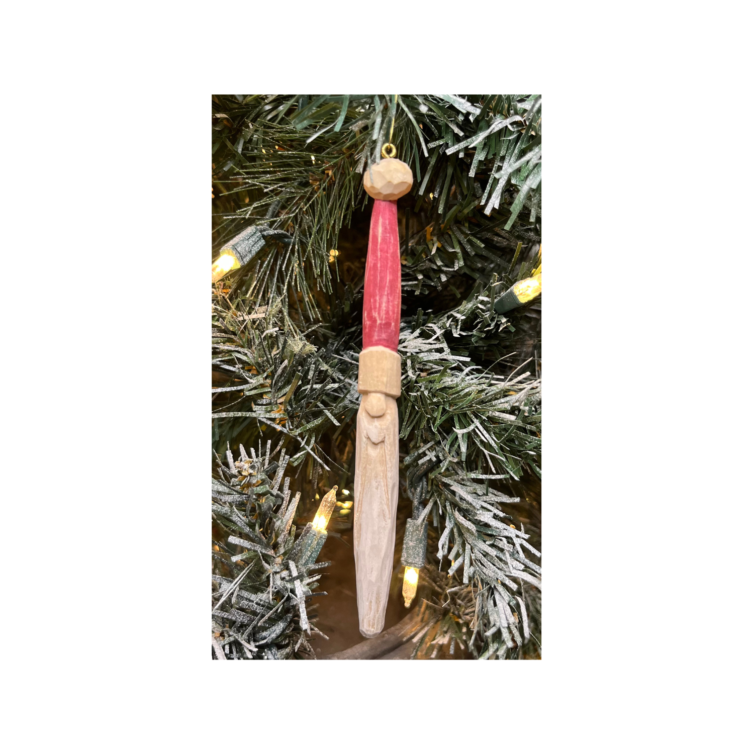 Meet Kris "Slim" Kringle—the jolliest, most diet-conscious Kris Kringle you'll ever hang on your tree! Hand-carved with care and a touch of holiday magic, this lanky little Saint Nick brings charm, whimsy, and just the right amount of festive cheer. Whether he’s squeezing down chimneys or just striking a pose, this one-of-a-kind ornament is sure to make your holiday décor a little more merry and bright!