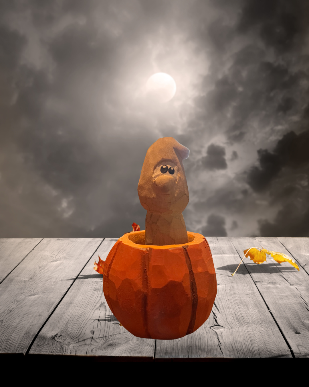 Small in size but big on charm! This handcarved miniature ghost is peeking out of his pumpkin home, glowing with just the right touch of Halloween magic. Each piece is carved and painted by hand, making it completely one-of-a-kind — a tiny treasure for any spooky-season shelf.