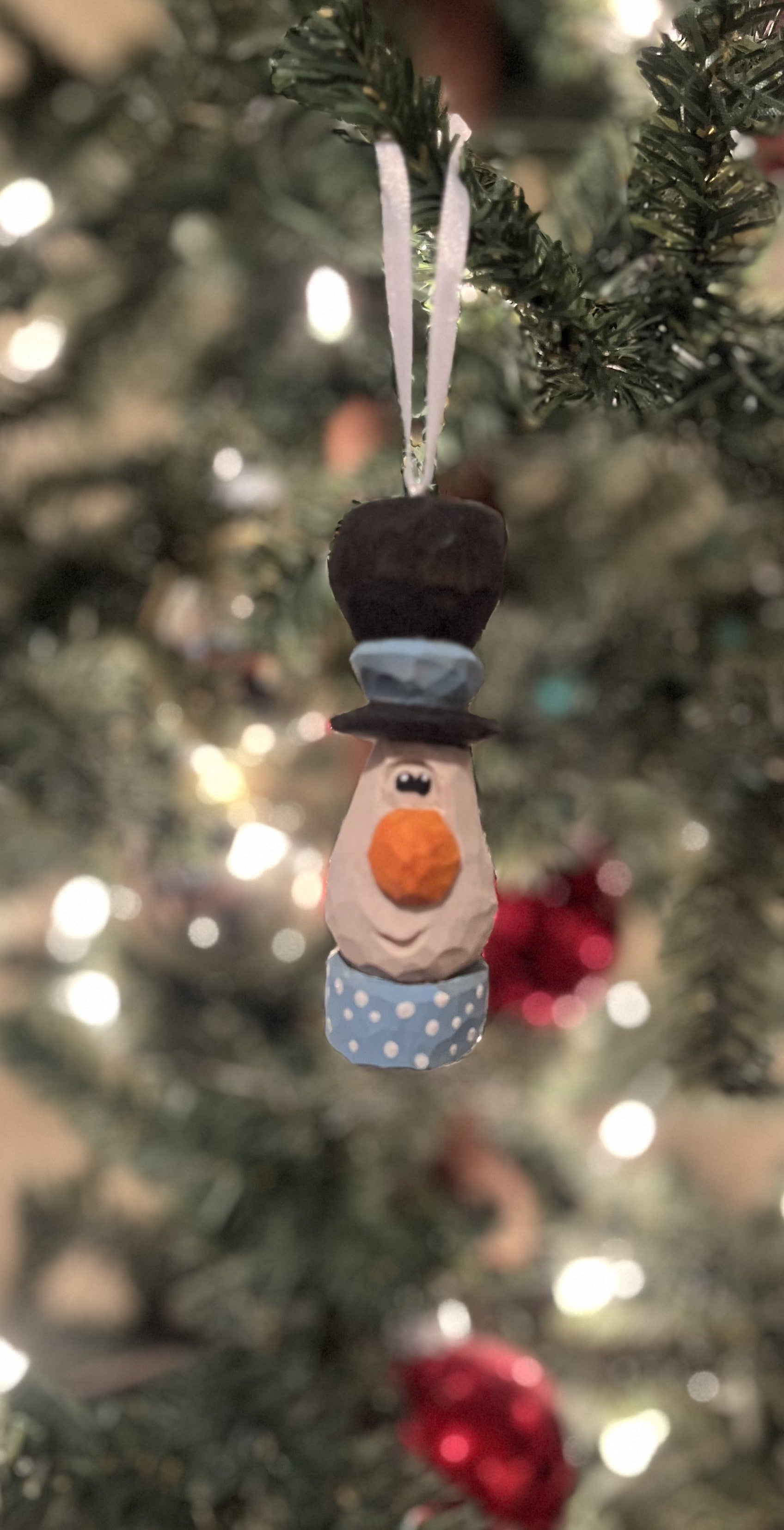 Handcarved and handpainted with a bright winter scarf, this cheerful snowman is full of rustic charm and mountain-town spirit. Each one is carved slow and made true, making no two exactly alike.