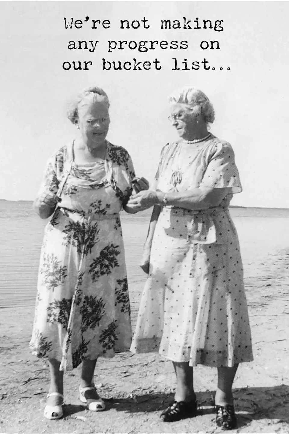 A humorous greeting card from our Trash Talk By Annie Collection displaying a vintage photograph with complementing sentiments. Card features "We're Not Making Any Progress On Our Bucket List..." sentiment on the outside and "Let's Change That 'B' To An 'F' So We'll Feel Better About It." sentiment on the inside with space to add a personalized message. Our Progress On Bucket List greeting card is a hilarious gifting option for everyday moments.