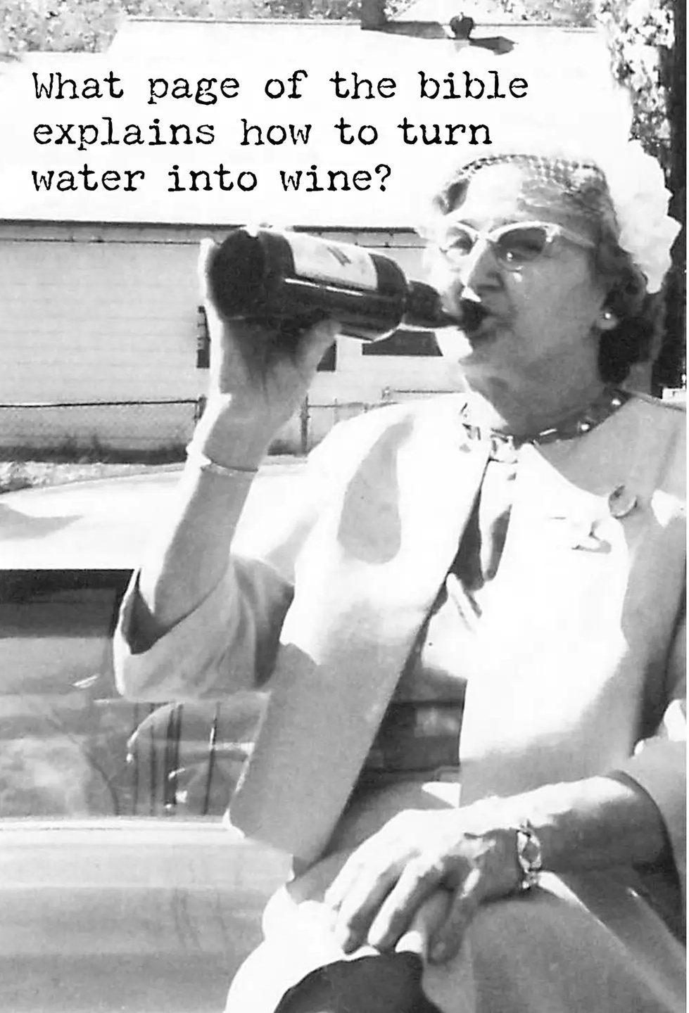 A humorous greeting card from our Trash Talk by Annie Collection features a vintage photograph with "What Page Of The Bible Explains How To Turn Water Into Wine…" sentiment on the outside, and "Asking For A Friend." sentiment on the inside.